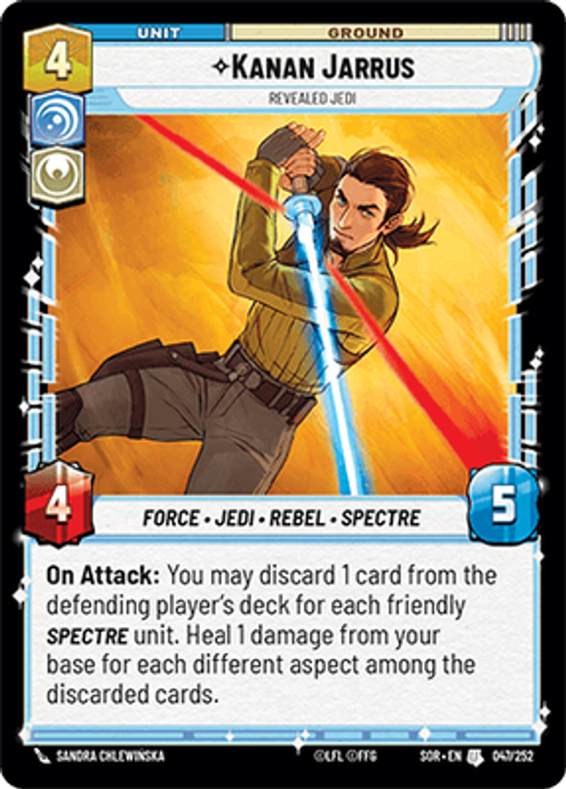 Kanan JarrusRevealed JediForce • Jedi • Rebel • SpectreOn Attack: You may discard 1 card from the defending player's deck for each friendly SPECTRE unit. Heal 1 damage from your base for each different aspect among the discarded cards.Power: 4Health: 5Sandra Chlewińska
