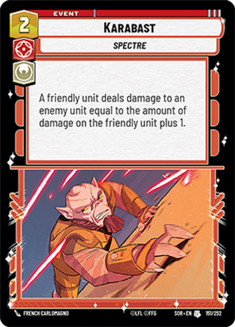 KarabastSpectreA friendly unit deals damage to an enemy unit equal to the amount of damage on the friendly unit plus 1.French Carlomagno