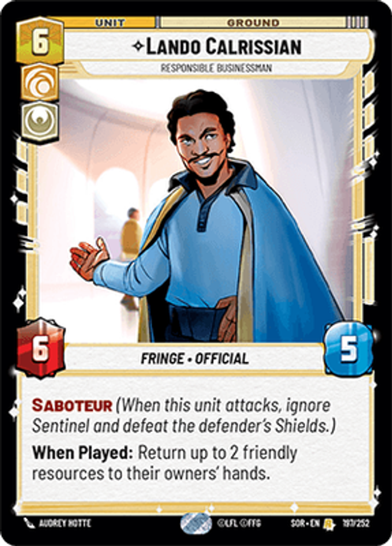 Lando CalrissianResponsible BusinessmanFringe • OfficialSaboteur (When this unit attacks, ignore Sentinel and defeat the defender's Shields.) When Played: Return up to 2 friendly resources to their owners' hands.Power: 6Health: 5Audrey Hotte