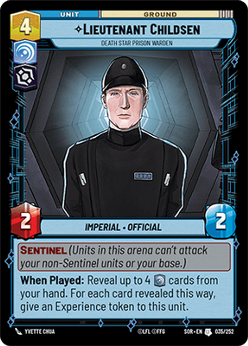Lieutenant ChildsenDeath Star Prison WardenImperial • OfficialSentinel (Units in this arena can't attack your non-Sentinel units or your base.) When Played: Reveal up to 4 [Vigilance] cards from your hand. For each card revealed this way, give an Experience token to this unit.Power: 2Health: 2Yvette Chua