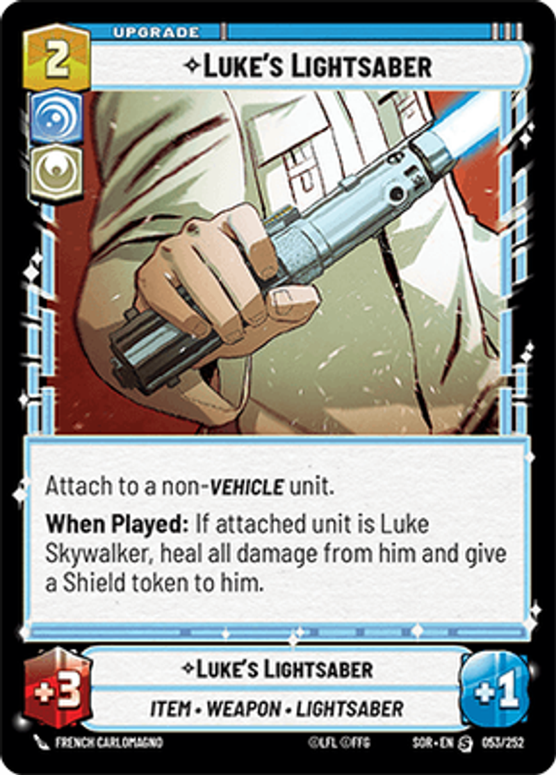 Luke's LightsaberItem • Weapon • LightsaberAttach to a non-Vehicle unit. When Played: If attached unit is Luke Skywalker, heal all damage from him and give a Shield token to him.Power: 3Health: 1French Carlomagno