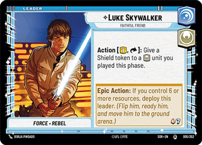 Luke SkywalkerFaithful FriendForce • RebelAction [1 resource, exhaust]: Give a Shield token to a [Heroism] unit you played this phase. Power: 4Health: 7Borja Pindado