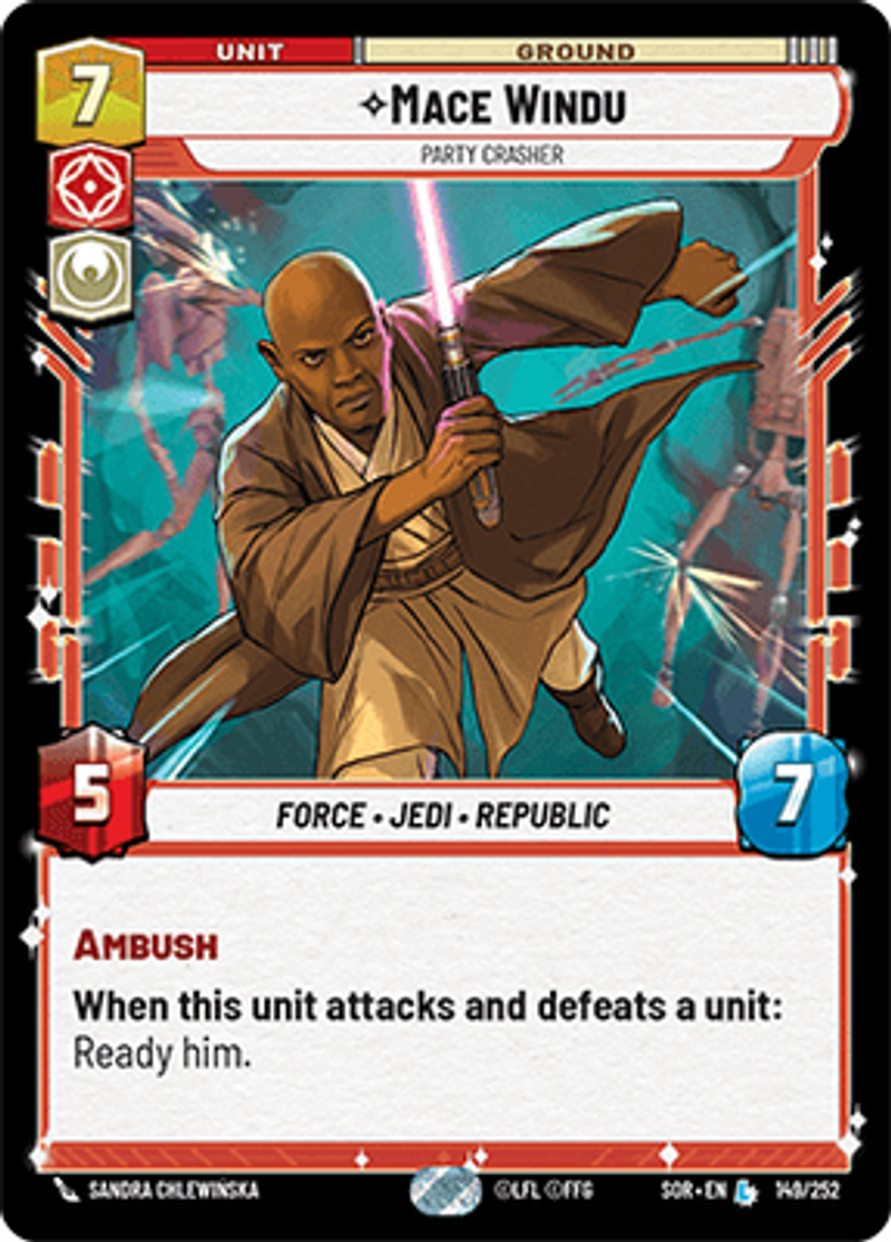 Mace WinduParty CrasherForce • Jedi • RepublicAmbush When this unit attacks and defeats a unit: Ready him.Power: 5Health: 7Sandra Chlewińska