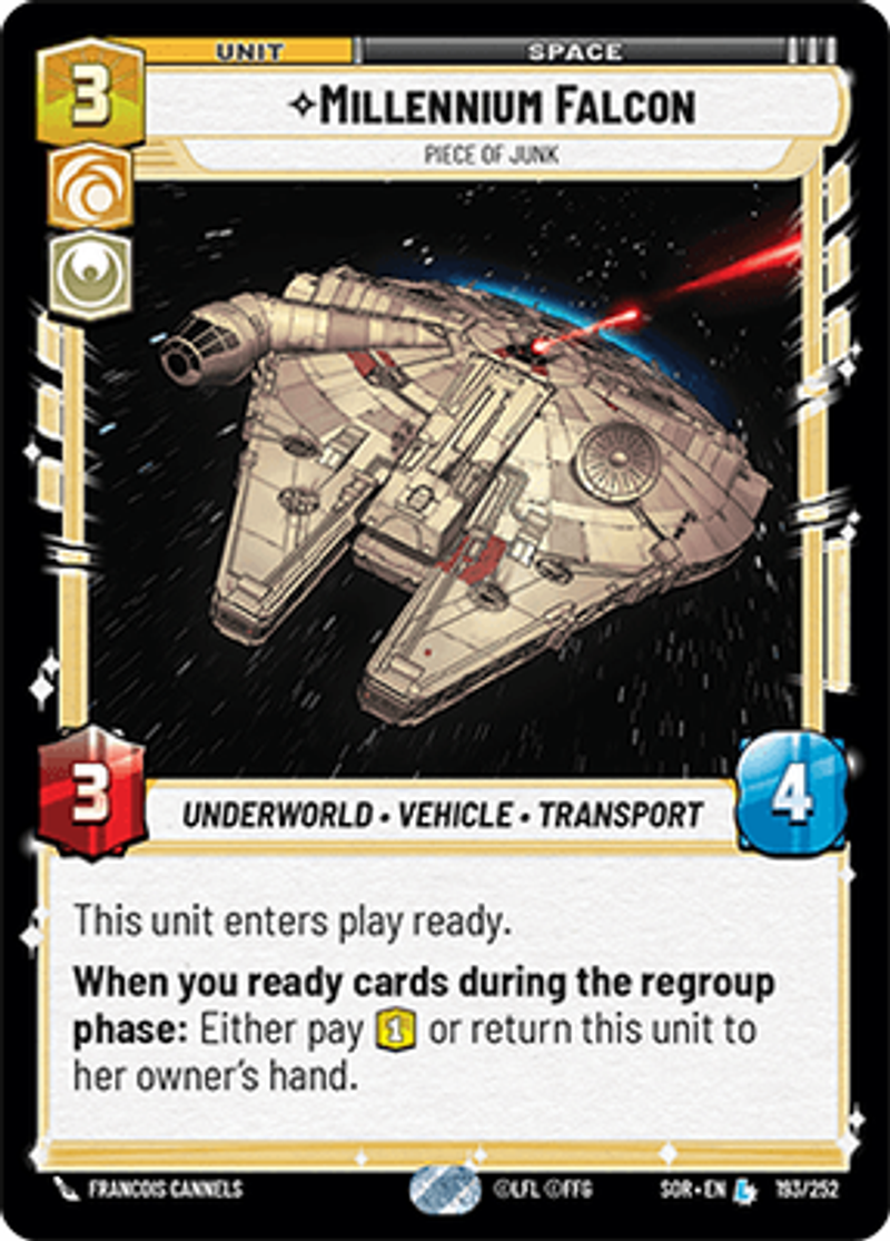 Millennium FalconPiece of JunkUnderworld • Vehicle • TransportThis unit enters play ready. When you ready cards during the regroup phase: Either pay [1 resource] or return this unit to her owner's hand.Power: 3Health: 4Francois Cannels