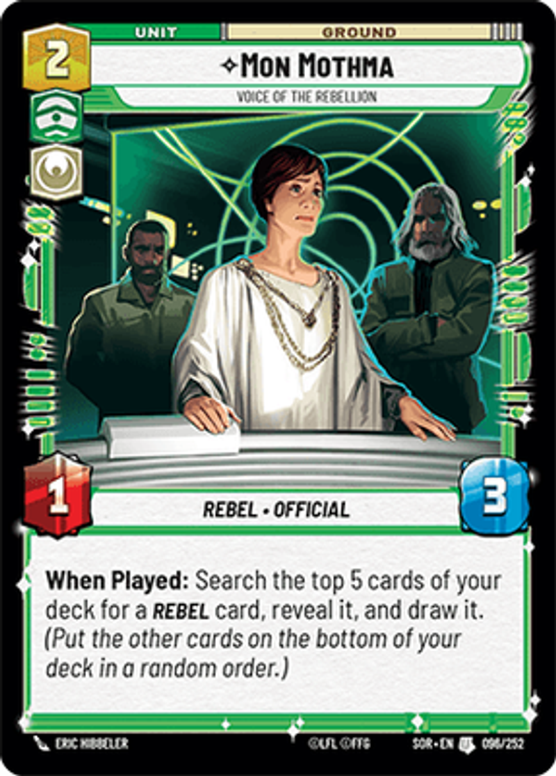 Mon MothmaVoice Of The RebellionRebel • OfficialWhen Played: Search the top 5 cards of your deck for a REBEL card, reveal it, and draw it. (Put the other cards on the bottom of your deck in a random order.)Power: 1Health: 3Eric Hibbeler