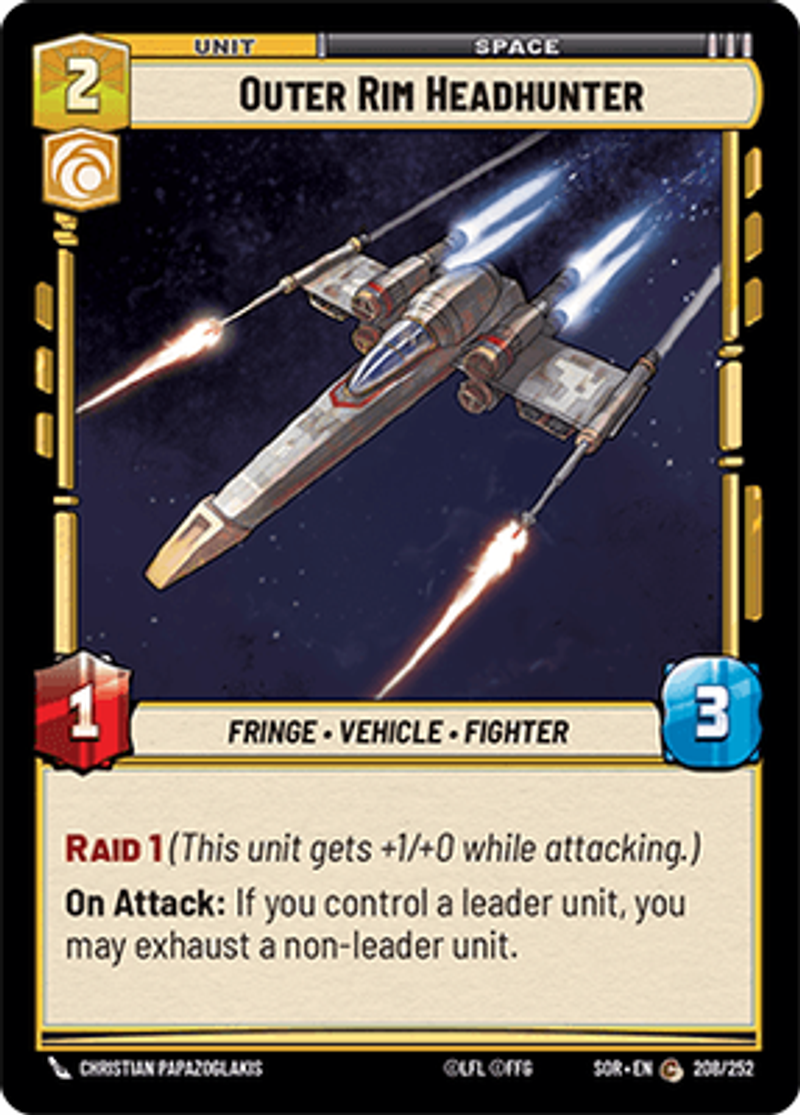 Outer Rim HeadhunterFringe • Vehicle • FighterRaid 1 (This unit gets +1/+0 while attacking.) On Attack: If you control a leader unit, you may exhaust a non-leader unit.Power: 1Health: 3Christian Papazoglakis