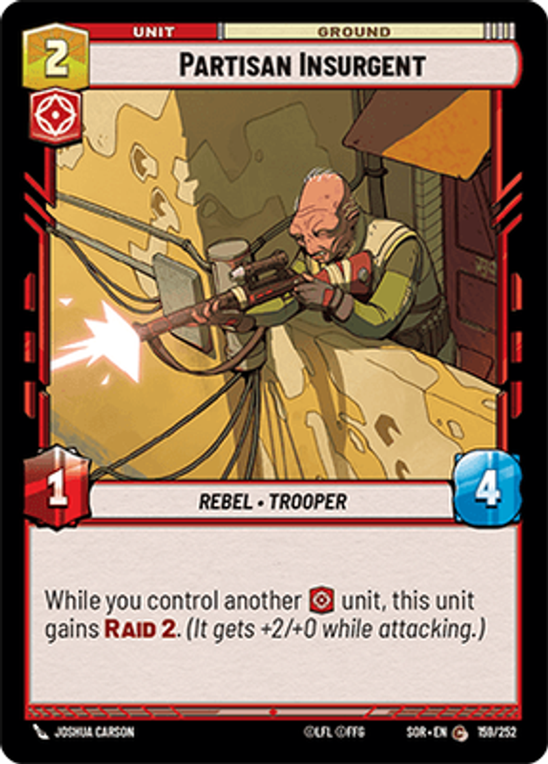 Partisan InsurgentRebel • TrooperWhile you control another [Aggression] unit, this unit gains Raid 2. (It gets +2/+0 while attacking.)Power: 1Health: 4Joshua Carson