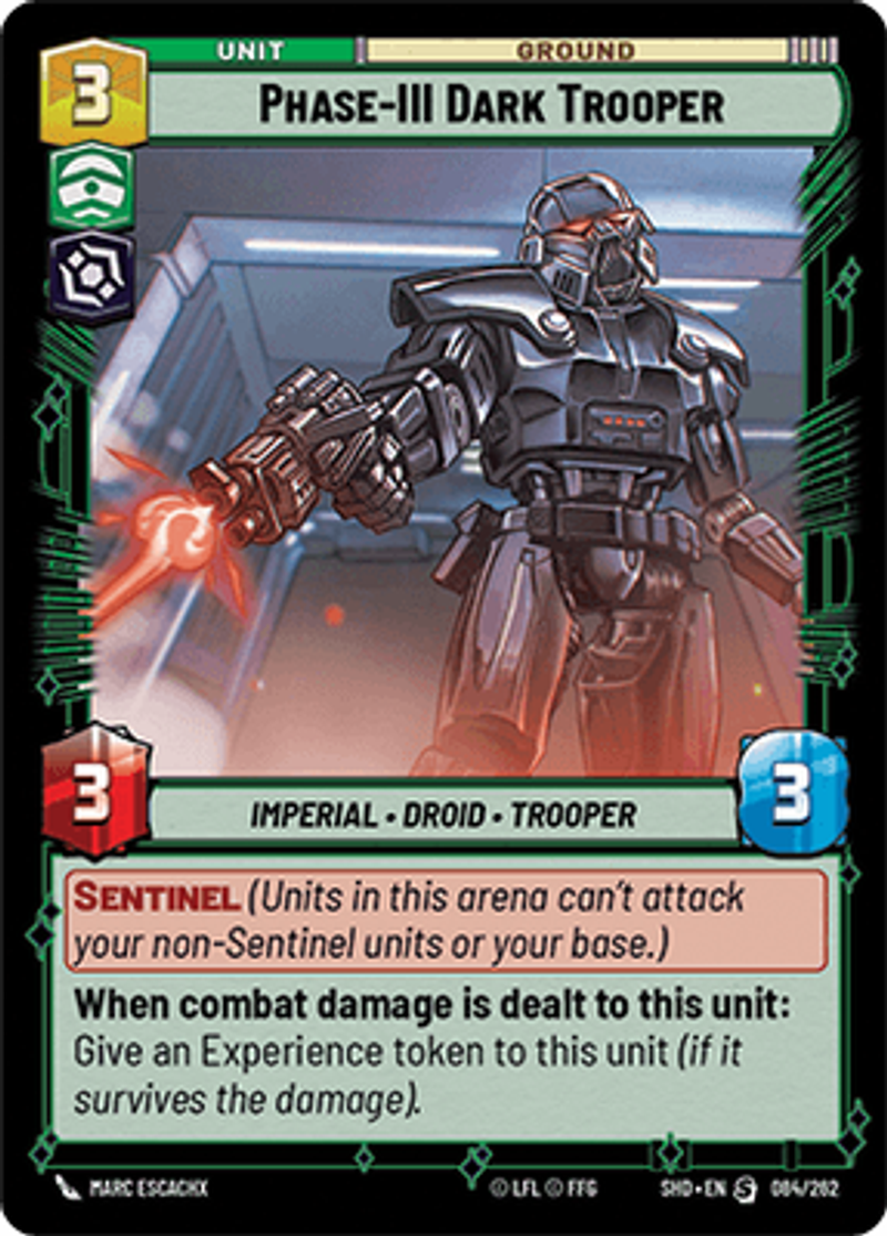 Phase-III Dark TrooperImperial • Droid • TrooperSentinel (Units in this arena can’t attack your non-Sentinel units or your base.) When combat damage is dealt to this unit: Give an Experience token to this unit (if it survives the damage).Power: 3Health: 3Marc Escachx