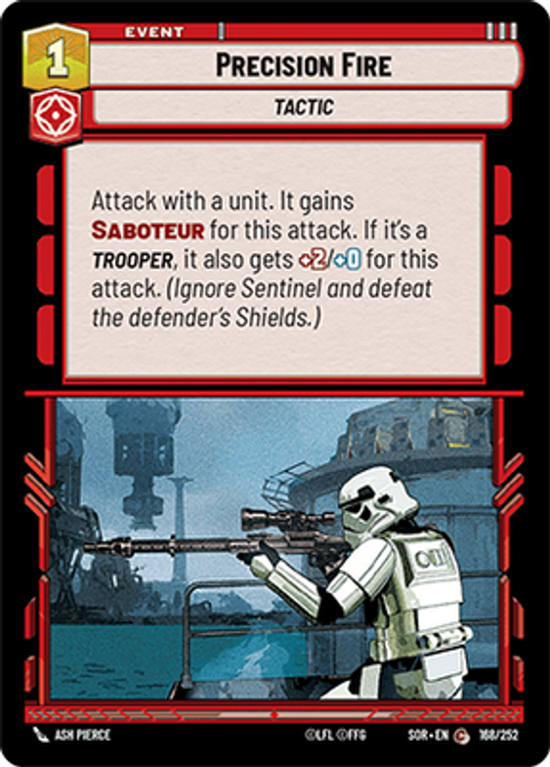 Precision FireTacticAttack with a unit. It gains Saboteur for this attack. If it’s a TROOPER, it also gets +2/+0 for this attack. (Ignore Sentinel and defeat the defender’s Shields.)Ash Pierce