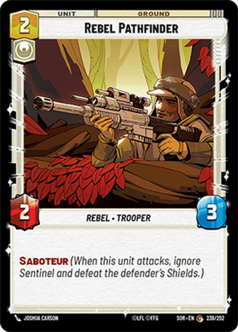 Rebel PathfinderRebel • TrooperSaboteur (When this unit attacks, ignore Sentinel and defeat the defender’s Shields.)Power: 2Health: 3Joshua Carson