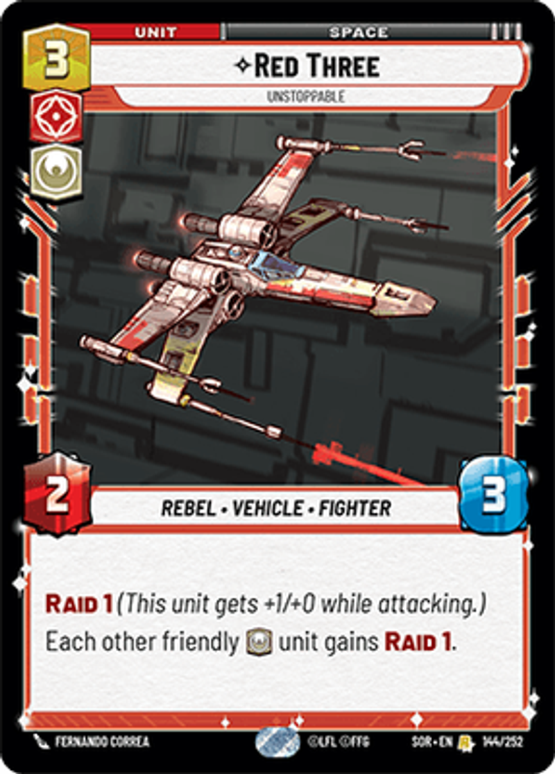 Red ThreeUnstoppableRebel • Vehicle • FighterRaid 1 (This unit gets +1/+0 while attacking.) Each other friendly [Heroism] unit gains Raid 1.Power: 2Health: 3Fernando Correa