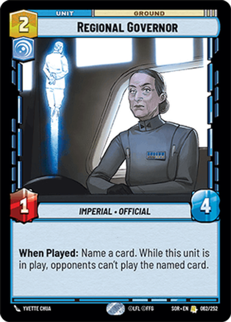 Regional GovernorImperial • OfficialWhen Played: Name a card. While this unit is in play, opponents can't play the named card.Power: 1Health: 4Yvette Chua