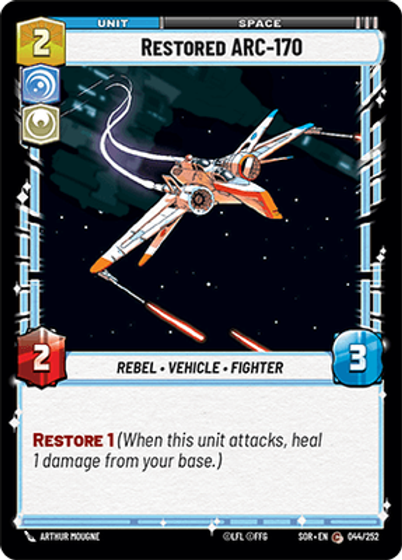 Restored ARC-170Rebel • Vehicle • FighterRestore 1 (When this unit attacks, heal 1 damage from your base.)Power: 2Health: 3Arthur Mougne