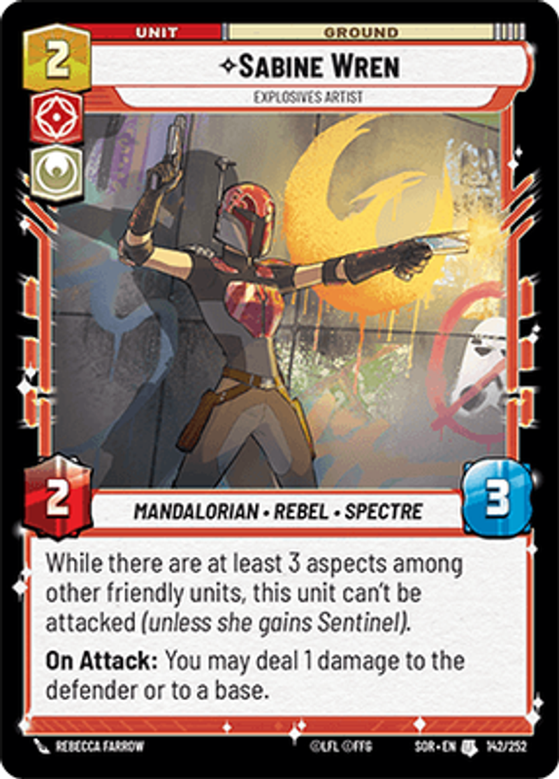 Sabine WrenExplosives ArtistMandalorian • Rebel • SpectreWhile there are at least 3 aspects among other friendly units, this unit can't be attacked (unless she gains Sentinel). On Attack: You may deal 1 damage to the defender or to a base.Power: 2Health: 3Rebecca Farrow