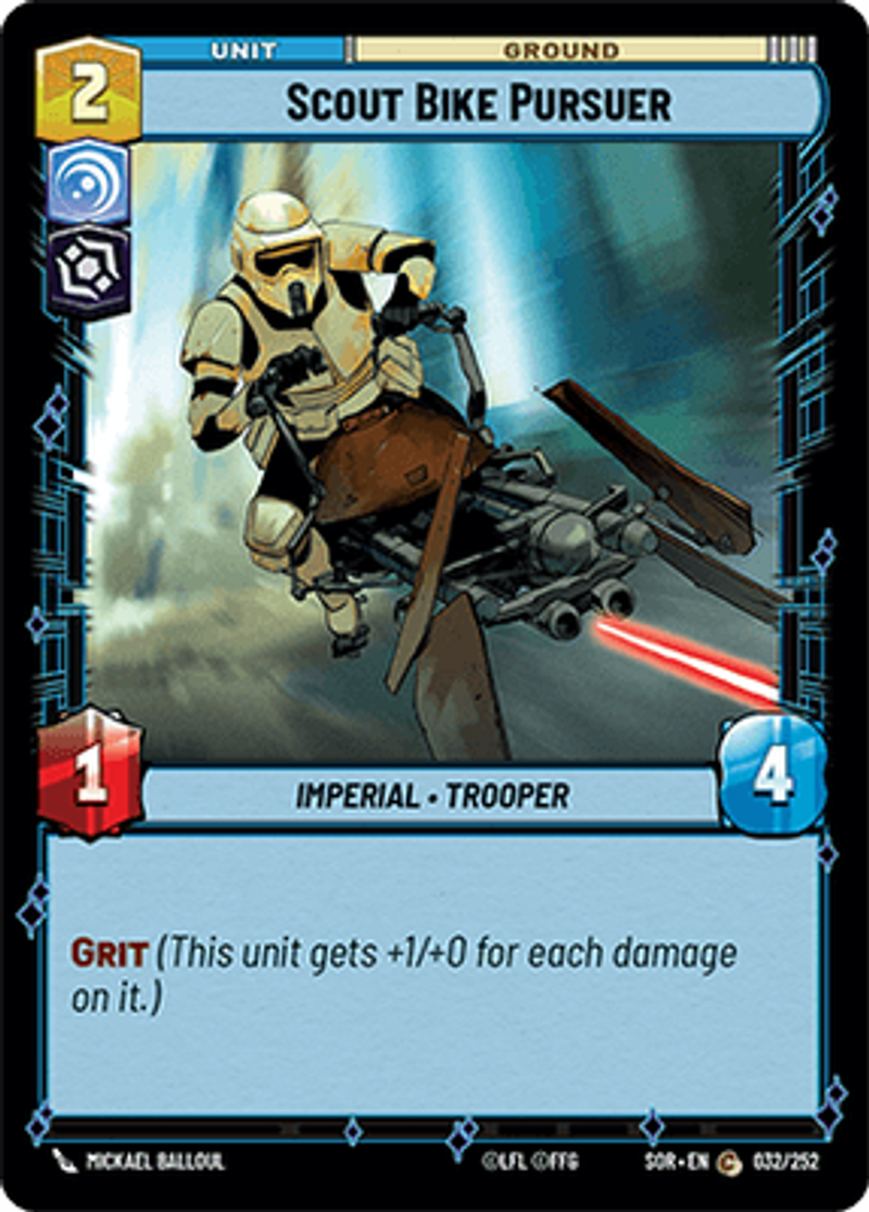 Scout Bike PursuerImperial • TrooperGrit (This unit gets +1/+0 for each damage on it.)Power: 1Health: 4Mickael Balloul