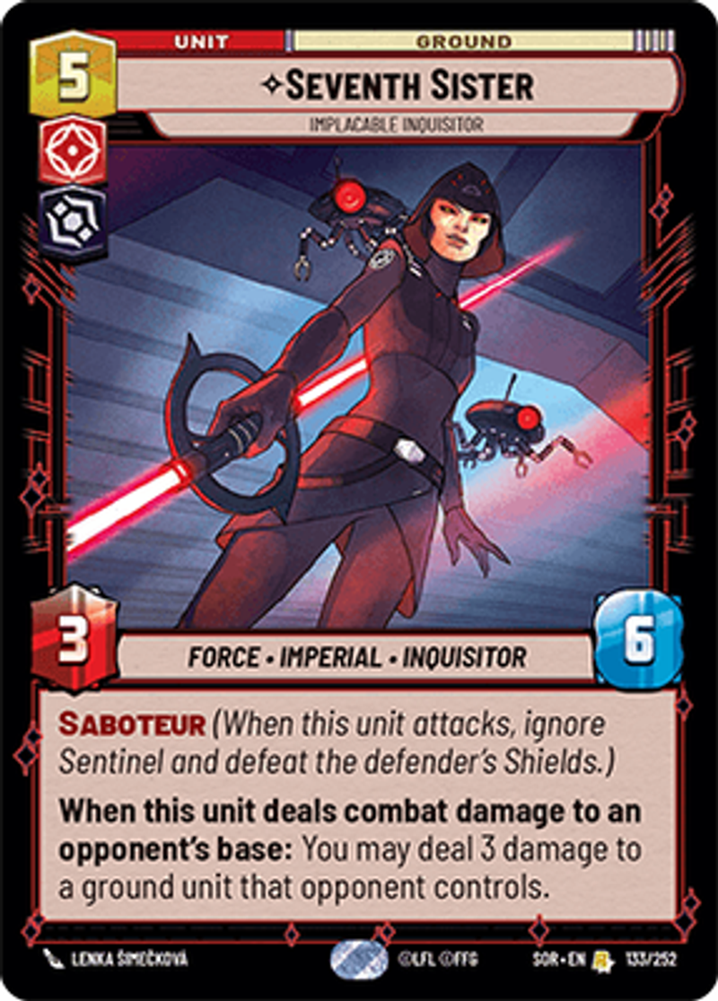 Seventh SisterImplacable InquisitorForce • Imperial • InquisitorSaboteur (When this unit attacks, ignore Sentinel and defeat the defender’s Shields.) When this unit deals combat damage to an opponent’s base: You may deal 3 damage to a ground unit that opponent controls.Power: 3Health: 6Lenka Šimečková