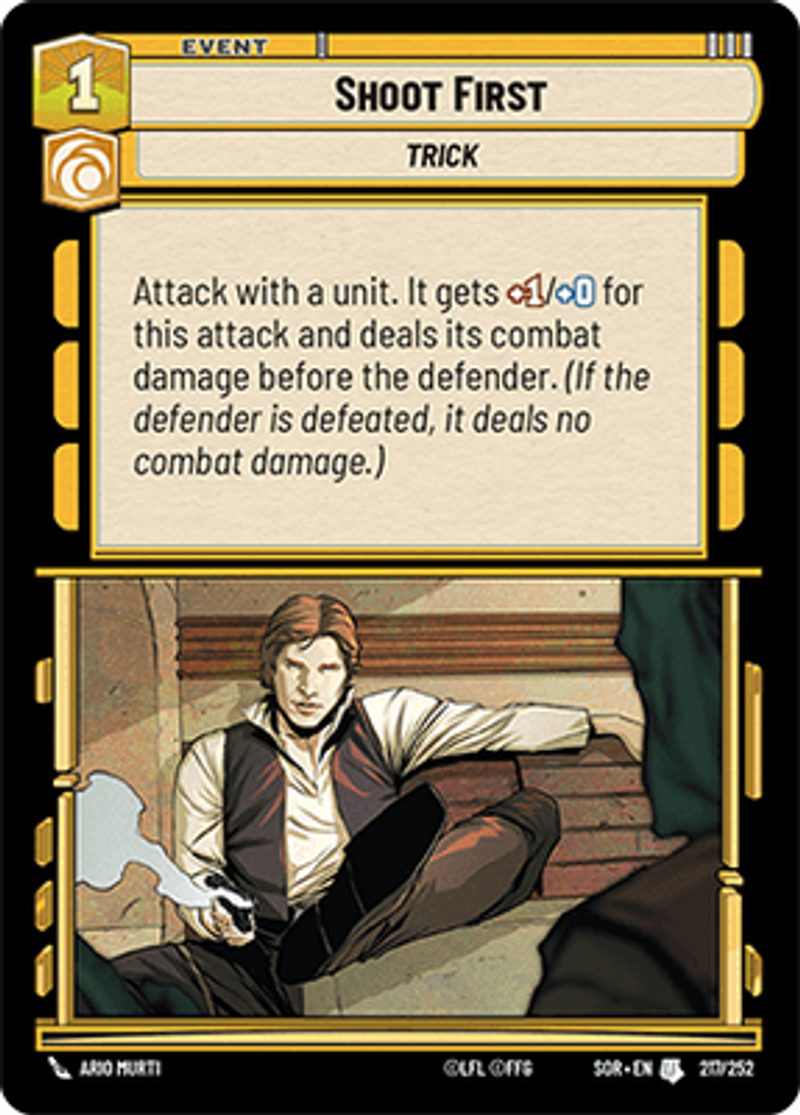 Shoot FirstTrickAttack with a unit. It gets +1/+0 for this attack and deals its combat damage before the defender. (If the defender is defeated, it deals no combat damage.)Ario Murti
