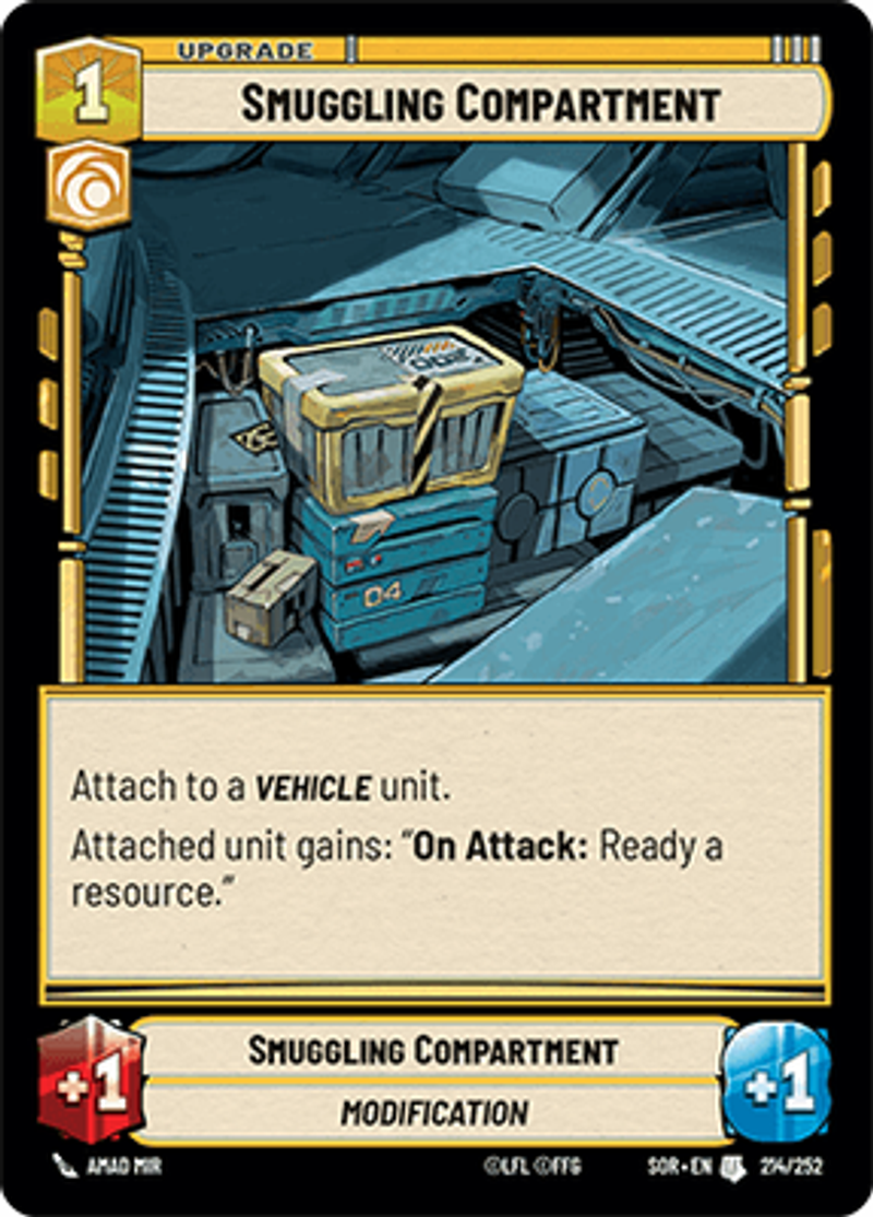 Smuggling CompartmentModificationAttach to a VEHICLE unit. Attached unit gains: "On Attack: Ready a resource."Power: 1Health: 1Amad Mir