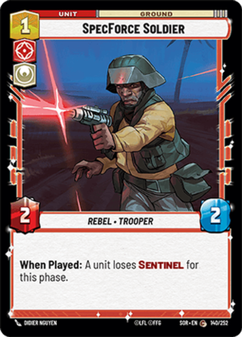 SpecForce SoldierRebel • TrooperWhen Played: A unit loses Sentinel for this phase.Power: 2Health: 2Didier Nguyen