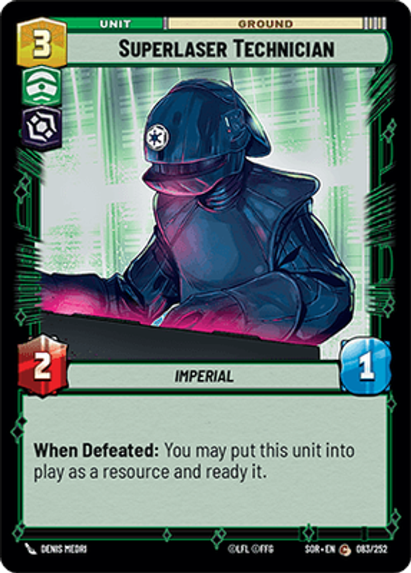 Superlaser TechnicianImperialWhen Defeated: You may put this unit into play as a resource and ready it.Power: 2Health: 1Denis Medri
