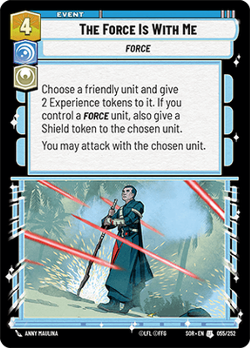 The Force Is With MeForceChoose a friendly unit and give 2 Experience tokens to it. If you control a FORCE unit, also give a Shield token to the chosen unit. You may attack with the chosen unit.Anny Maulina