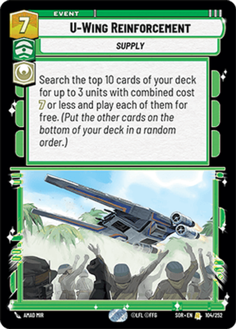 U-Wing ReinforcementSupplySearch the top 10 cards of your deck for up to 3 units with combined cost 7 or less and play each of them for free. (Put the other cards on the bottom of your deck in a random order.)Amad Mir