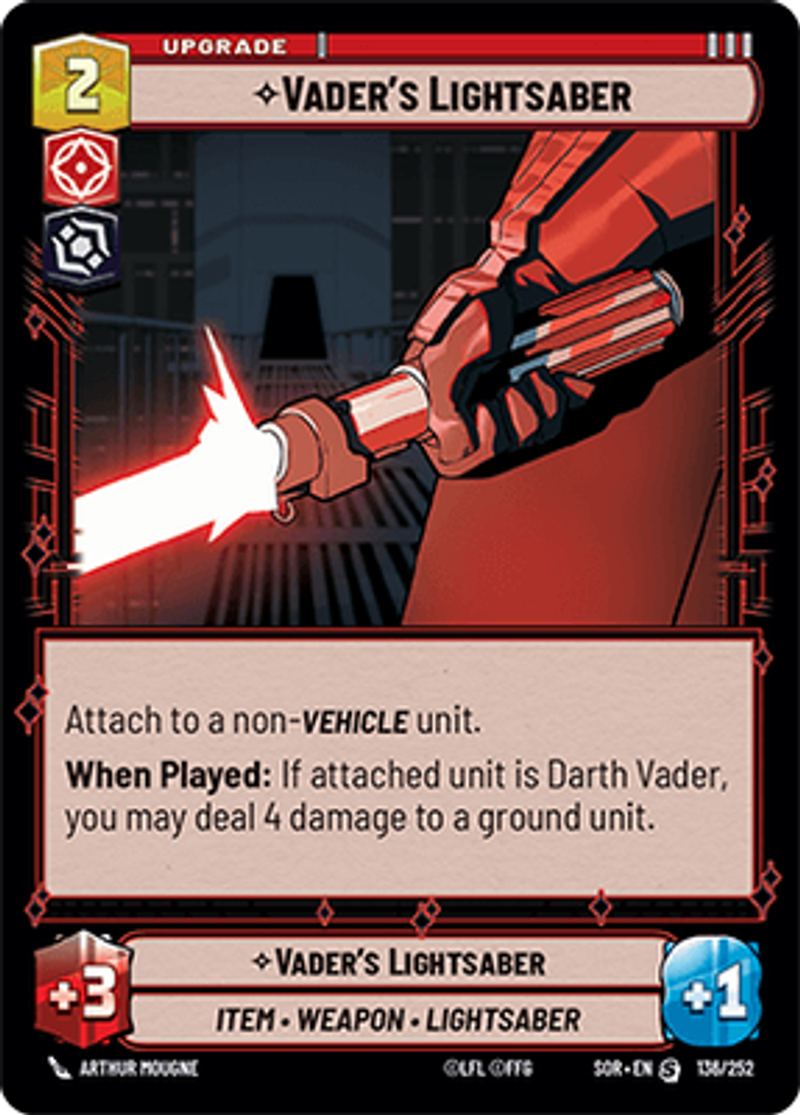 Vader's LightsaberItem • Weapon • LightsaberAttach to a non-Vehicle unit. When Played: If attached unit is Darth Vader, you may deal 4 damage to a ground unit. Power: 3Health: 1Arthur Mougne