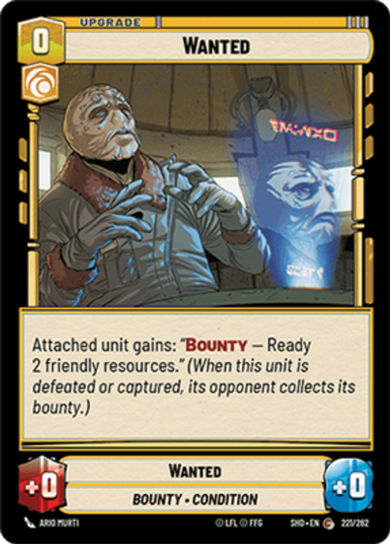 WantedBounty • ConditionAttached unit gains: “Bounty — Ready 2 friendly resources.” (When this unit is defeated or captured, its opponent collects its bounty.)Power: 0Health: 0Ario Murti