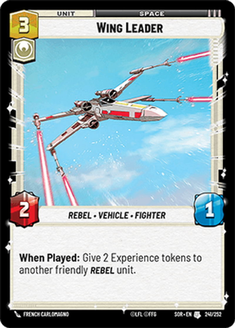 Wing LeaderRebel • Vehicle • FighterWhen Played: Give 2 Experience tokens to another friendly REBEL unit.Power: 2Health: 1French Carlomagno